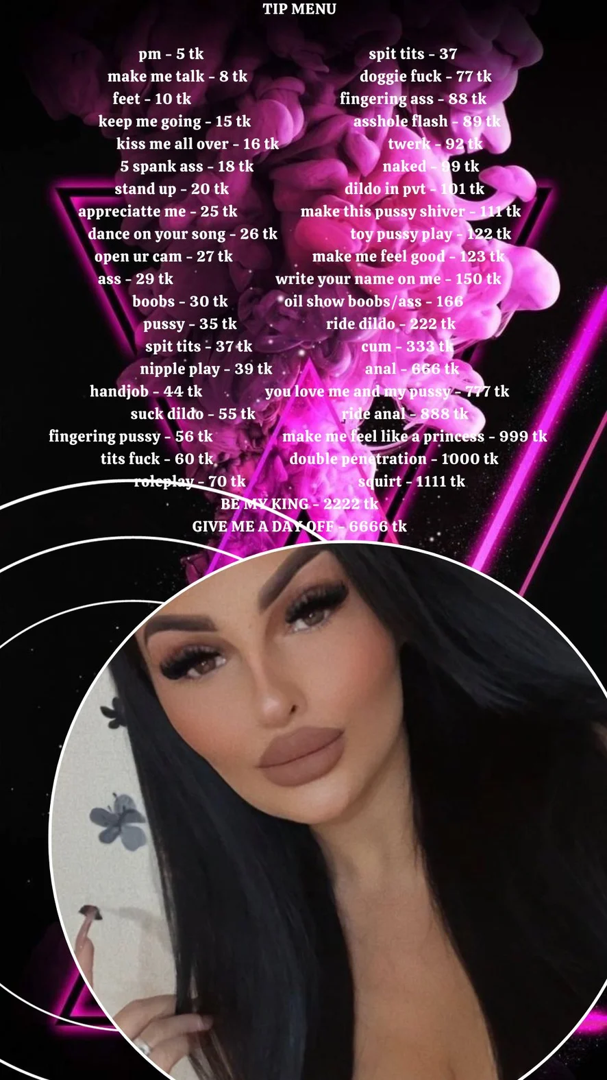 Ahegao, Dirty Talk, Erotic Dance, Fingering, Masturbation, Twerk, Blowjob, Dildo or Vibrator, Tittyfuck, Striptease, Spanking, Smoking